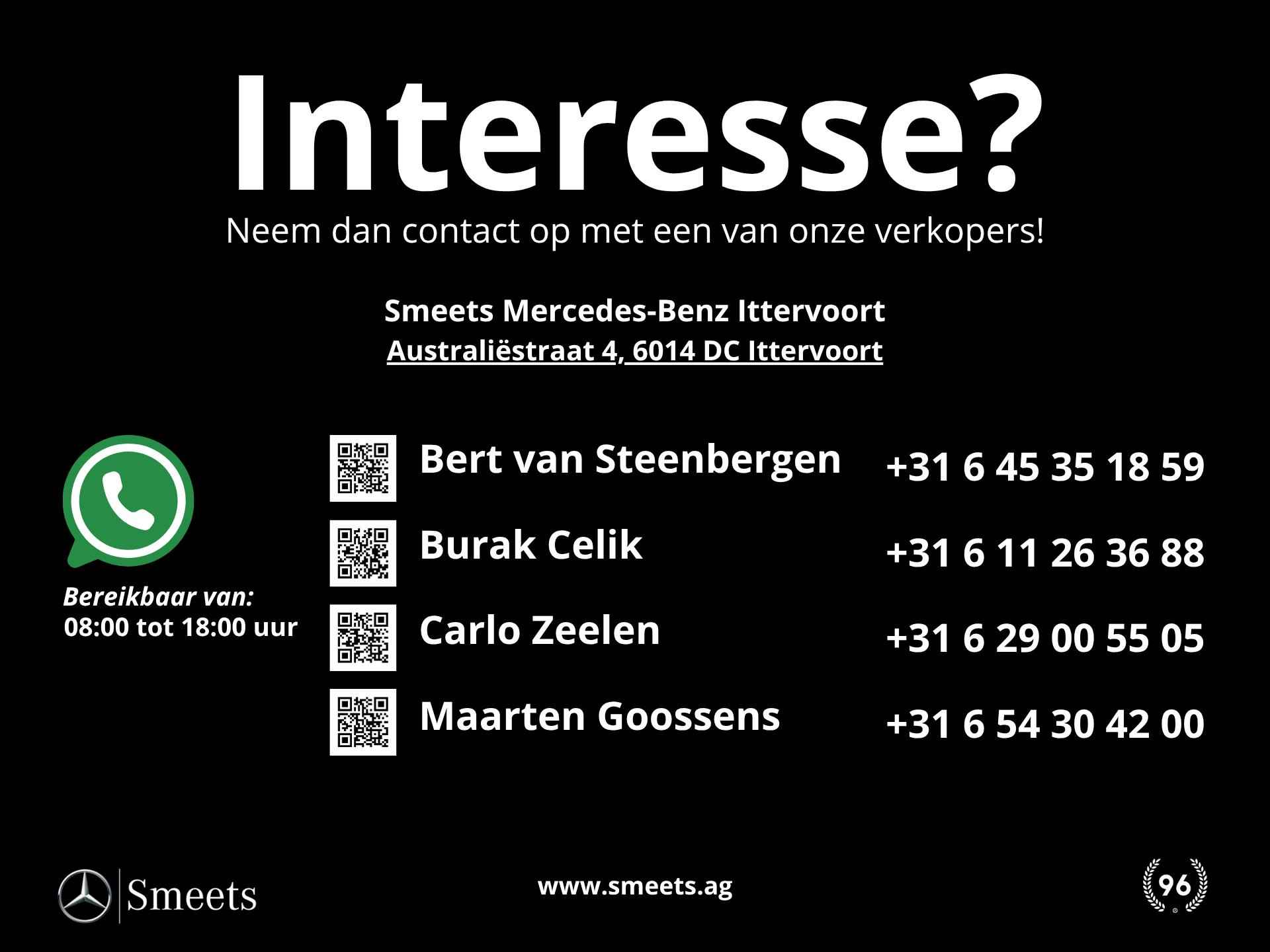 ** De ServiceCareUsed prijzen zijn vanaf-prijzen incl. btw, geldig tot en met 31-12-2025, voor de maximumduur en/of het maximum aantal kilometers, afhankelijk van welke limiet het eerste bereikt wordt en op voorwaarde dat de onderhoudsbeurten uitgevoerd worden bij een officiële Mercedes-Benz dealer, volgens de voorschriften van de fabrikant. Meer informatie en de volledige voorwaarden zijn verkrijgbaar bij uw Mercedes-Benz dealer. Mercedes-Benz Nederland B.V. behoudt zich te allen tijde het recht voor om de prijzen te wijzigen. Onder voorbehoud van tussentijdse wijzigingen en fouten.